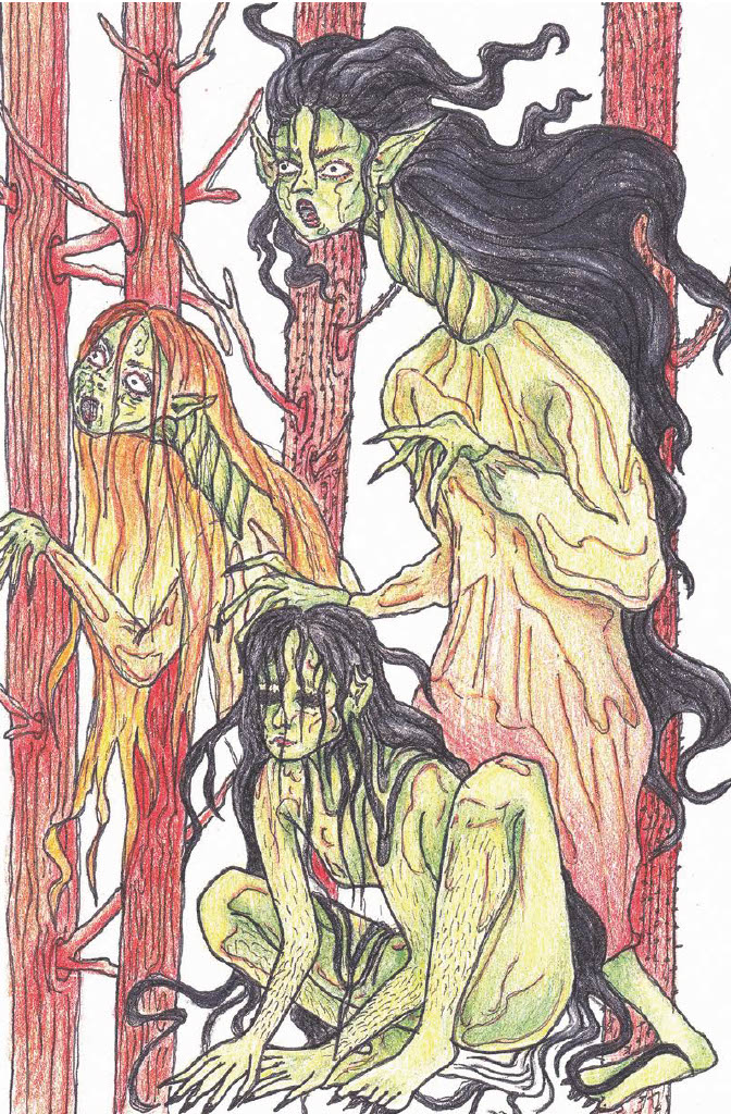 Od stráně ke klukům dolehl dívčí zpěv, hlasy sílily a pomalu se blížily. Chlapci přivřeli zraky, ztuhli a čekali, co se bude dít. Náhle u nich stály tři divoženky, prohlížely si chlapce pod houní a všemožně kroutily hlavami. „Světem chodíme celá staletí, všechno už jsme slyšely i viděly, ale aby měl člověk dvě hlavy, jedno tělo a čtyři nohy, to jsme ještě neviděly nikdy,“ opakovaly divé ženy jedním udiveným hlasem a začaly se jedna přes druhou chechtat. Jejich smích zněl jako vichřice lámající větve stromů. Do vší té hrůzy najednou dolehl kostelní zvon, ohlašující jednu hodinu. Tajuplné ženy splynuly s mlhou a zmizely spolu s ní kamsi k lesu. Chlapci popadli houni, vyskočili na koňské hřbety a k smrti vyděšení se hnali největší rychlostí zpátky k domovu.