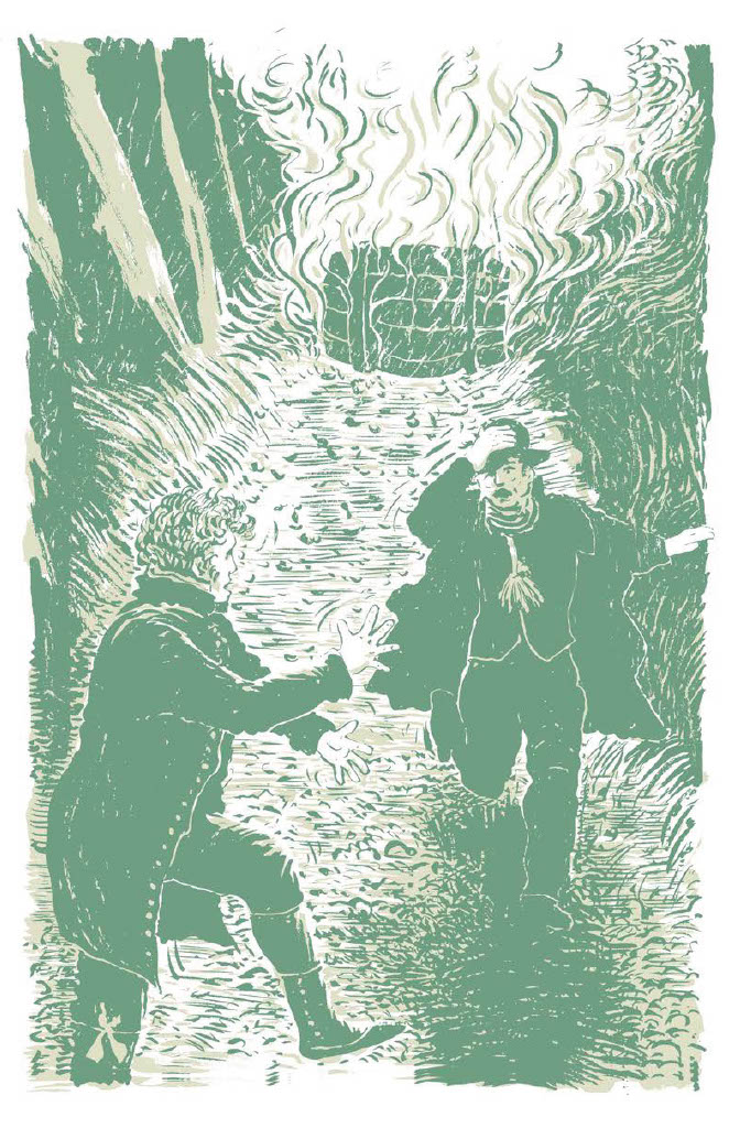 V křoví si chystali velké kusy bílých pláten a smáli se, jak třetího vyděsí k smrti, zatímco ten už byl, protože akorát minula půlnoc, na cestě zpátky k domovu. V jednu chvíli čeledíni pohlédli nahoru směrem k lesu a oba zbledli. Přímo k nim se řítil obří hořící sud.