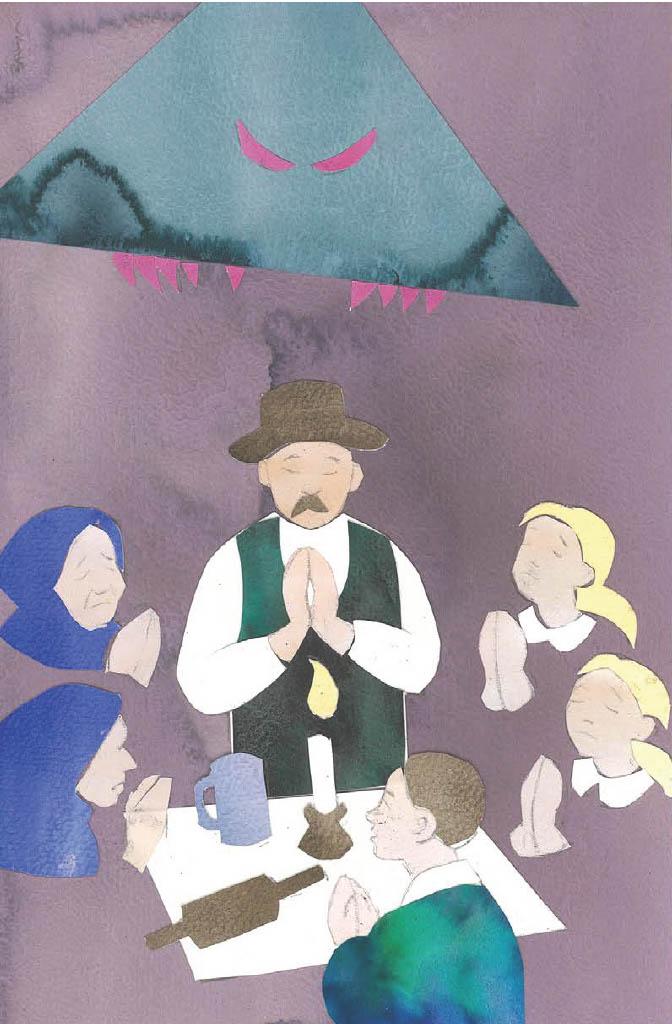 Škrábání utichlo a táta se pyšně rozhlédl kolem. Chtěl něco říct, ale ještě než otevřel pusu, začalo strašidlo škrábat pod podlahou v rohu místnosti. Pantáta svěsil ruce a celá rodina byla bezradná. Škrábání pak pokračovalo každou noc.