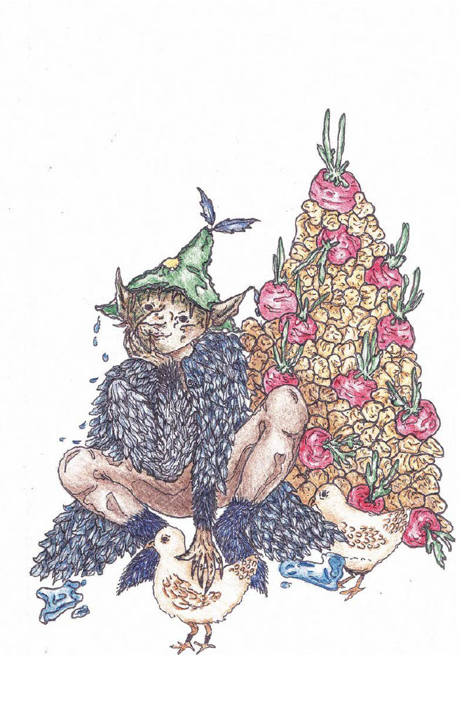 Protřel si oči a zaostřil zrak oním směrem, odkud na něj mával jakýsi skřítek, který připomínal přerostlé černé kuře. Skřítek netrpělivě poskakoval na okraji obří hromady, oči mu zářily nadšením, jaké ohromné dílo vykonal. U toho něco brebentil, snad že se rozhodl hospodáři pomáhat, ale možná jen tak pípal jako kuře. V tu chvíli si už byl hospodář skoro jist, že se mu vše zdá, že se musí teprve vzbudit, a až se probere, půjde jako každé ráno do stodoly, v níž žádná pyramida řepy nebude, natož aby u ní poskakovalo černé kuře či snad skřítek. Jenomže za hospodářem se už do stodoly přiřítili jeho synové, kteří nevydrželi nikdy ani vteřinu na jednom místě a pohybovali se stejně příčetně jako můra okolo světla.