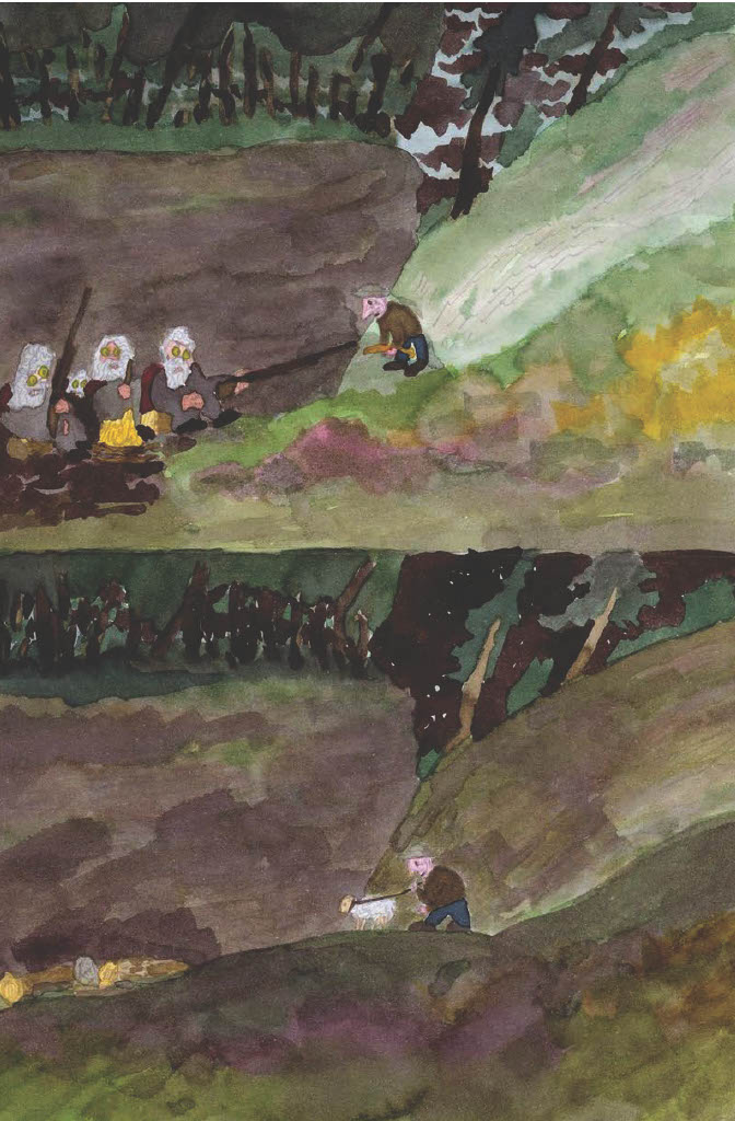 V té době žil ve vesnici Drahonín stařeček, který celé léto sbíral byliny, aby z nich dělal čaje a léky pro své sousedy. Jednou ráno se vypravil pro osladič, léčivou kapradinu, rostoucí nejčastěji na tmavých a vlhkých místech. Moc dobře věděl, kde roste. V lese jen malý kousek za Drahonínem se nacházelo divoké údolí s vodopádem, kde rostly osladičů celé trsy. Opatrně sestupoval po pěšině na dno rokle, a když byl skoro dole, vytřeštil oči údivem. Namísto koupajících se ptáků a mloků uviděl ohniště, kolem kterého seděli čtyři vousatí chlapi v pestrých vojenských uniformách. Stařeček chtěl utéct, ale tajemní cizinci mu zastoupili cestu. Jeden z nich mu položil ruku na rameno a tiše povídá: „Ničeho se neboj, nechceme ti ublížit…“