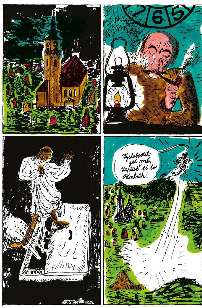 O několik dní později, když náš ponocný zase pokuřoval na návsti a už si nebyl jistý, zda se mu všechno jen nezdálo, před půlnocí se vše odehrálo nanovo. Ponocný, aniž by dokázal říct proč, utíkal ke hřbitovu, svlečený duchův rubáš sebral a vrátil se s ním na náves, kde se bál nejméně. Pak mu došlo, co vlastně udělal, a začal se tak klepat, až se s ním klepala celá lavička. Vyděšeně a trochu nedočkavě hleděl ke hřbitovu. Byl zvědavý, co se bude dít, až se mrtvý vrátí z procházky, a stejně tak se k smrti bál, co se bude dít, až se mrtvý vrátí z procházky. Když se blížila čtvrtá, ranní duch se objevil skoro u něj. Sápal se k ponocnému a křičel, ať mu okamžitě vrátí pyžamo. Začal po něm sahat rukou. Ponocný si v tu chvíli nebyl jistý, zda ještě žije, nebo už mu srdce dávno puklo strachy a uteklo na hřbitov. V té chvíli se samy od sebe rozezněly zvony a umrlec se skácel k zemi. Ještě dvakrát to mrtvý zkusil znovu a pokaždé ho zvuk zvonů srazil k zemi. Pak se ozval první kohout ve vsi a ponocný uslyšel odkudsi: „Vysvobodil jsi mě, pánbůh ti to zaplať.“